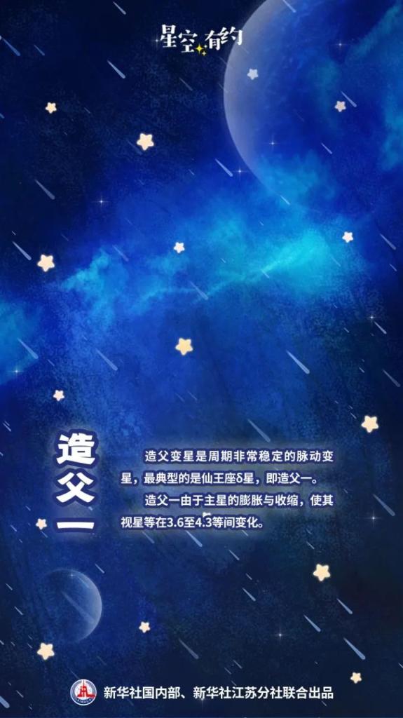 造父变星是周期极度沉稳的脉动变星,最典型的是仙王座δ星,即造父一。造父一是由两颗恒星构成的双星系统,由于主星的扩张与松开,使其视星等在3.6至4.3等间变化。它的光变周期是5天8小时47分,像钟表般准确。