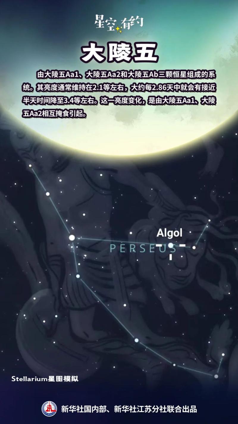 食变星中的“明星”,有英仙座中的第二亮星大陵五。王科超先容,大陵五是由大陵五Aa1、大陵五Aa2和大陵五Ab三颗恒星构成的系统。其亮度频频保管在2.1等傍边,玩忽每2.86天中就会有接近半天时辰降至3.4等傍边。这一亮度变化,是由大陵五Aa1、大陵五Aa2相互掩食引起的。