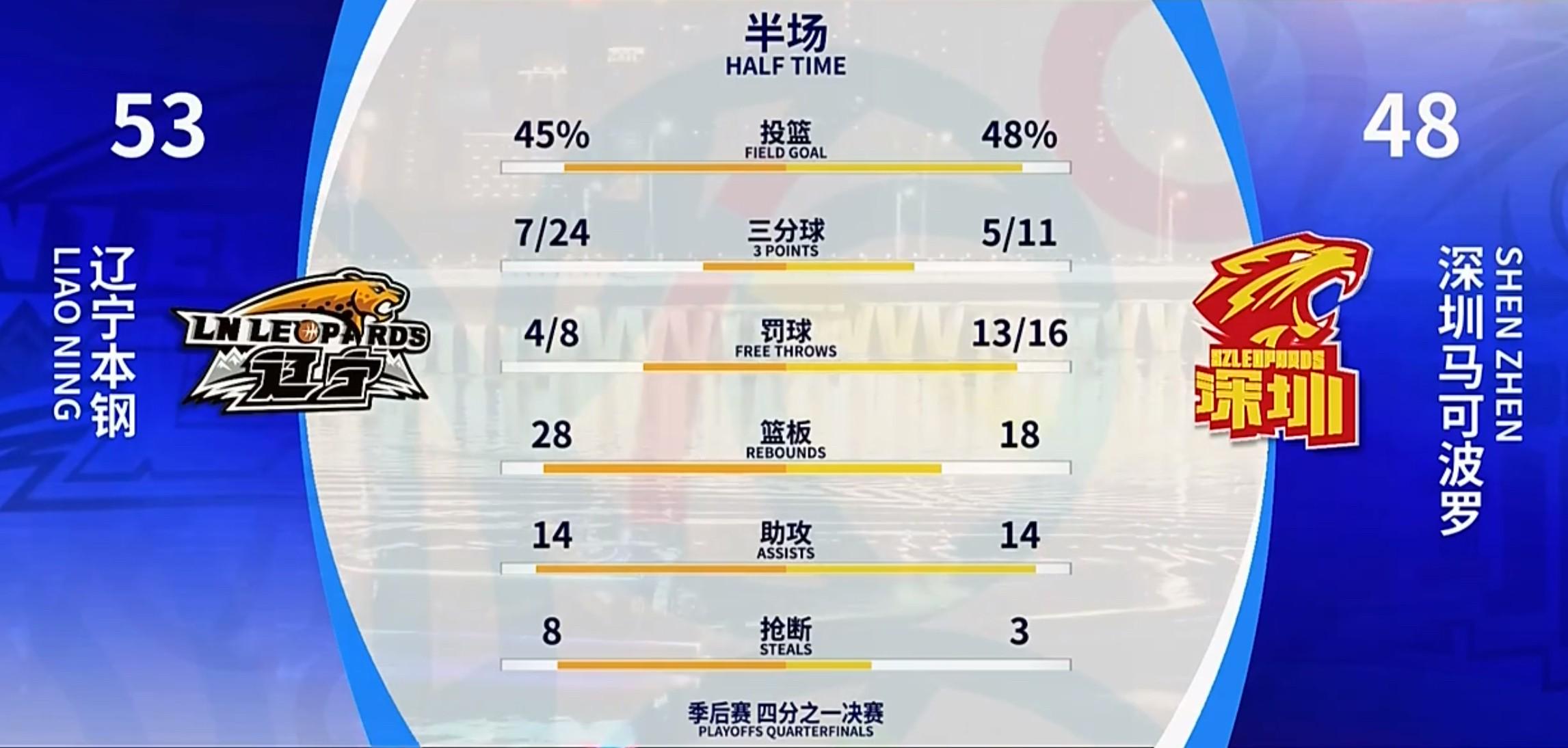 北京时分4月20日,CBA季后赛1/4决赛G2,辽宁男篮主场迎战深圳男篮,半场比赛放胆,辽宁53-48逾越深圳。