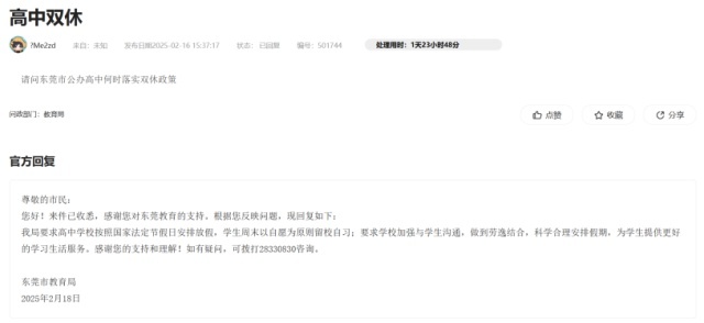 在“问政湖南”平台,“长沙高中家长反对双休”成热帖。